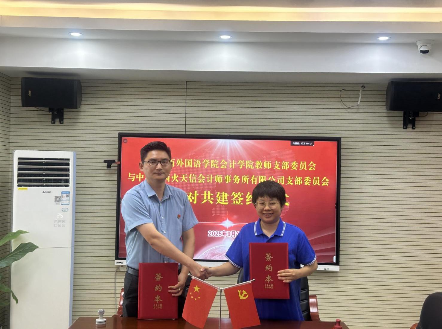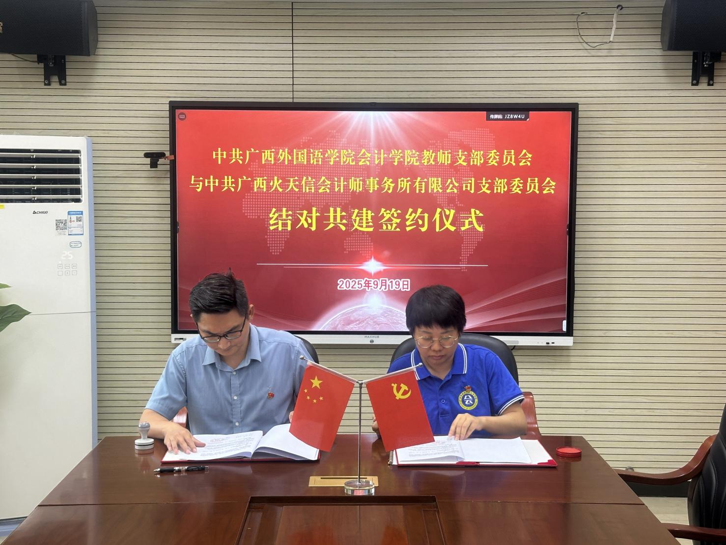 为深化党组织共建合作,激活党建 “红色引擎”,2025 年 9 月 19 日,广西火天信会计师事务所党支部与广西外国语学院会计学院教师党支部正式签署结对共建协议,并举行授牌仪式,标志着双方在党建引领下开启校企合作新篇章。